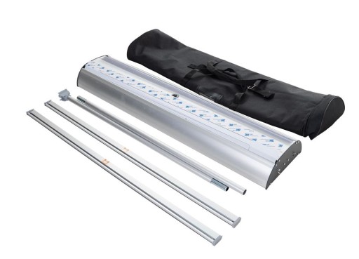 - Transport: Wzmocniona torba transportowa z okienkiem na wizytówkę, ułatwiająca przenoszenie i przechowywanie roll upu.
