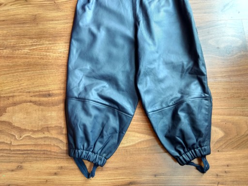 czarne nieprzemakalne przeciwdeszczowe i przeciwśniegowe spodnie na regulowanych szelkach z gumy z klamrami zatrzaskowymi w pasie po bokach ściągane gumą dół nogawek ściągany gumą napy ułatwiające zakładanie dodatkowo regulowane i odpinane gumy na buty stan idealny wymiary szer w pasie max-38 cm szer bez naciągania -30 cm dł bez szelek-71 cm dł nogawki od kroku-38 cm rozmiar z metki to 92 ale pasuje i na większy rozmiar
