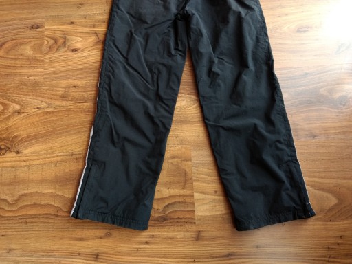 czarne z białymi lamówkami nieprzemakalne sportowe spodnie na pasku z gumą dodatkowo w pasie wiązane trokami na dole po bokach nogawek zamki ułatwiające zakładanie z przodu wsuwane kieszenie wewnątrz podszewka w formie siateczki oddychającej ogólnie stan bdb -spodnie noszą ślady użytkowania- widoczne na zdjęciach wymiary dł całkowita-80 cm dł nogawki od kroku-57 cm szer w pasie bez naciągania-27 cm szer max-39 cm