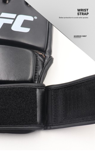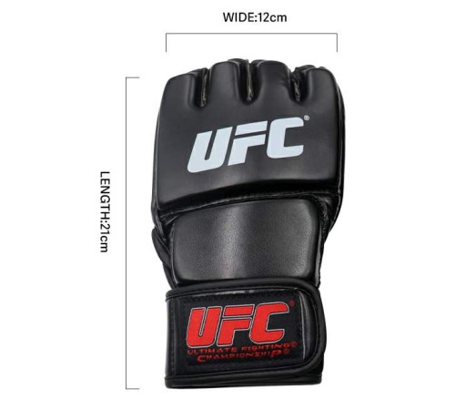Nowe nieużywane rękawice UFC - to profesjonalny produkt przeznaczony dla wymagających użytkowników, ceniących sobie przede wszystkim wysoką jakość, komfort, oraz bezpieczeństwo. Zostały wykonane z bardzo mocnego, odpornego na przetarcia i pęknięcia materiału dzięki czemu rękawica jest bardziej żywotna. Wewnętrzna część obszyta jest przyjemnym w dotyku materiałem podnoszącym komfort podczas treningu i wyczerpujących sparingów. Zapobiega obtarciom. Dzięki odkrytej wewnętrznej stronie rękawic zachowana zostaje odpowiednia cyrkulacja powietrza zapobiegająca nadmiernemu poceniu dłoni, jak również wpływa na pełną swobodę chwytu. Zewnętrzna część rękawic wypełniona została ulepszoną pianką lateksową która w pełni amortyzuje uderzenia chroniąc zewnętrzną część dłoni przed urazem. Mankiet zapięty na szeroki rzep dla pełnej ochrony nadgarstka. Rękawice idealnie dopasowują się do dłoni dając pełen komfort i swobodę chwytania podczas użytkowania