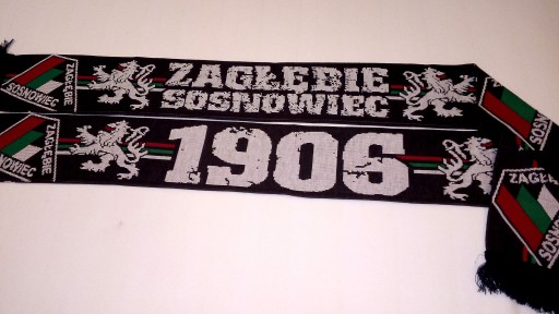 Wzór nr-1- ZAGŁĘBIE SOSNOWIEC- szal dziany,dwustronny, na końcach czarne frędzle.Napis na szaliku z jednej strony ZAGŁĘBIE SOSNOWIEC; z drugiej strony data 1906.