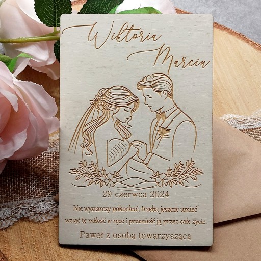 DREWNIANA PAMIĄTKA - KARTKA NA ŚLUB - PREZENT NA WESELE - ŻYCZENIA DLA PARY MŁODEJ (10x15 cm) GRAWEROWANA LASEROWO