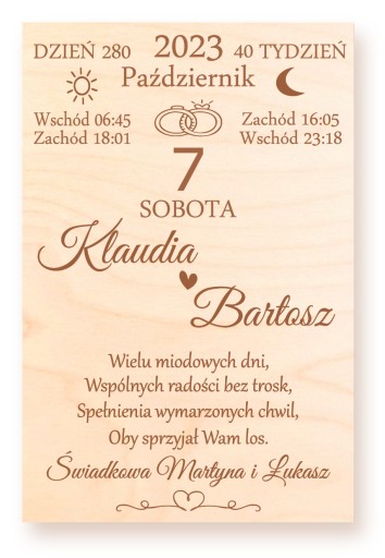 *parametry widocznie na kartce takie jak dzień tygodnia (sobota, niedziela itp) , numer dnia w roku, numer tygodnia w roku, wschód i zachód zostaną obliczone automatycznie na podstawie podanej daty zaślubin, a więc nie trzeba ich nam podawać. Jest możliwość zmiany wierszyka widocznego na zdjęciach (w tym celu prosimy wysłać własne życzenia - max 4 krótkie linijki tekstu).
