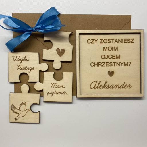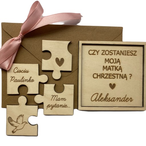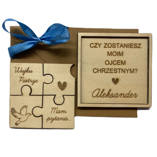 - Drewniane 4 puzzle przedstawiające ozdobną grafikę oraz spersonalizowany napis (należy podać imiona chrzestnych) np. "Ciociu Karolinko" , "Wujku Marcinie" itd. + napis "Mam pytanie".