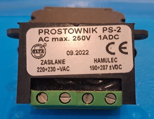 Układ zasilający PS–2 stanowi kompletny zespół do bezpośredniego montażu. Wyposażony w czterozaciskową listwę pozwala na swobodną adaptację w każdym współpracującym obwodzie. Układ jest przystosowany do zasilania ze źródła prądu przemiennego o wartości 220 ÷ 230VAC max. 250VAC co po wyprostowaniu i odpowiednim uformowaniu pozwala na otrzymanie napięcia stałego o wartości 190 ÷ 207VDC do zasilania hamulca.