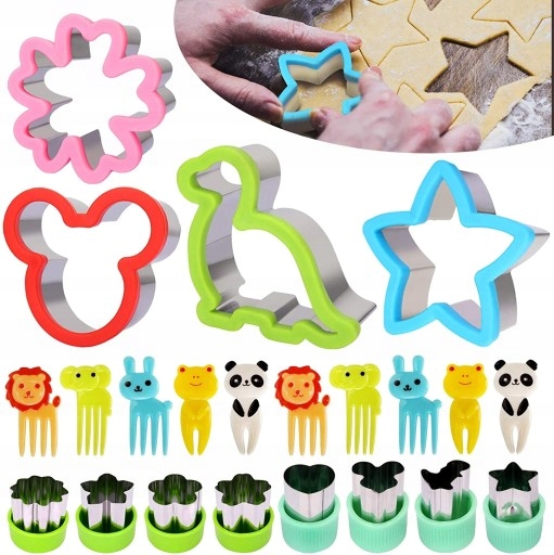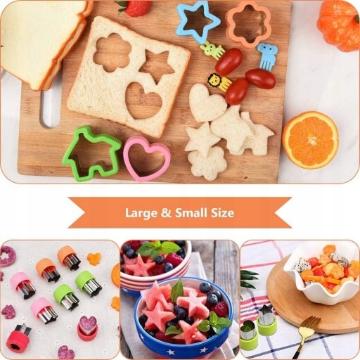 ? 【Wszechstronne formy 12 10 】- Zawiera 12 różnych foremek do wycinania żywności w zabawnych kształtach: 4 duże foremki do wycinania kanapek, 8 małych foremek do wykrawania warzyw, owoców, 10 innych akcesoriów. Uwielbiane przez dzieci, dzięki szerokiej gamie motywów, dzieci codziennie cieszą się próbą nowej części.