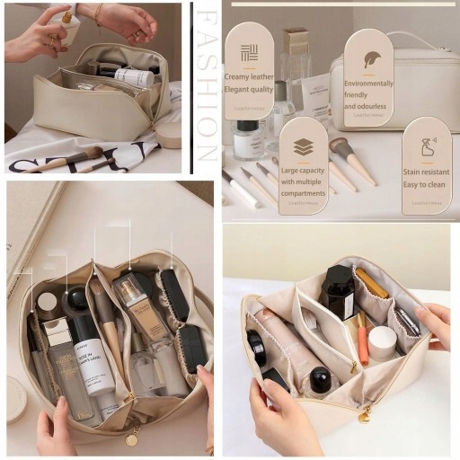 Kosmetyczka podróżna o dużej pojemności ma dwuwarstwową konstrukcję z wieloma przegrodami.Bardzo duża pojemność pomieści wszystkie Twoje kosmetyki, z otworami na pędzle i przegródkami, więc nie musisz się martwić o wyciekanie podczas podróży.