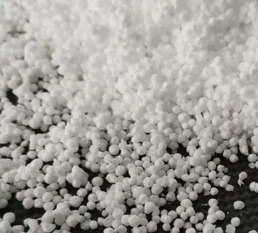 Regranulat z przemiału styropianowego bez zanieczyszczeń. Jest zapakowany w worek i pudełko kartonowe.