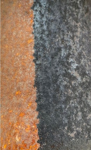 *Zdjęcie przedstawia element, na którym po jednej stronie nałożono neutralizator rdzy, następnie zabezpieczono miejsce czarną farbą (prawa strona).