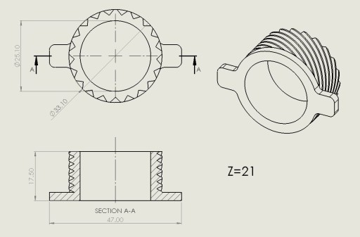 W tych ślimakach została wyeliminowana wada powodująca zbyt szybkie wycieranie się zębów - średnica ślimaka jest poszerzona. Rysunek pokazuje ślimak z oryginalnymi wymiarami. W rzeczywistości wysyłana jest troszeczkę szersza wersja. Odpowiednik 5NG251905000