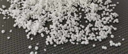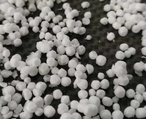 Regranulat z przemiału styropianowego bez zanieczyszczeń. Jest zapakowany w worek i pudełko kartonowe.