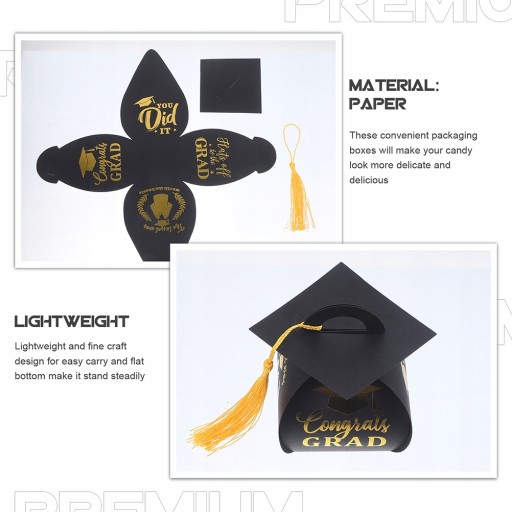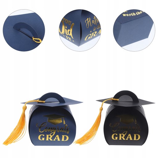 Możesz włożyć drobne upominki i domowe babeczki, ciasteczka, słodycze i czekoladki. Pudełka na cukierki w kształcie kapelusza ukończenia szkoły mogą dodać tajemnicy do twojego prezentu, dodać mu blasku i są idealne do dawania prezentów.