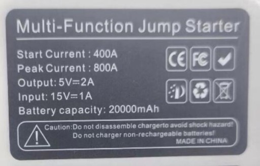 This Car Jump Booster uses 800 A of peak current and heavy-duty fixtures and cables. High rate A-class battery, 16000mAh large capacity, high rate polymer battery, high discharge efficiency, instant release of strong current to start the car