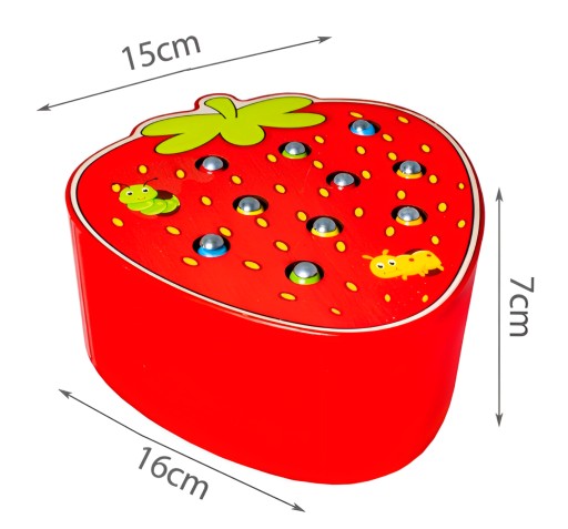 ✅ WCIĄGAJĄCA - Ta wyjątkowa drewniana zabawka to doskonały pomysł na zajęcie malucha. Zabawa polega na chwytaniu drewnianym kijkiem zakończonym magnesem robaczków ukrytych w otworkach znajdujących się wewnątrz truskawki, a następnie na ich ponownym wkładaniu. Jest to spore wyzwanie dla malucha, które wymaga skupienia uwagi oraz sprawności manualnej.
