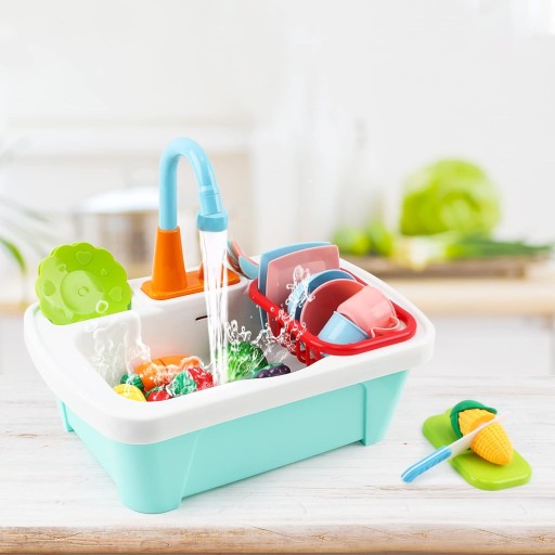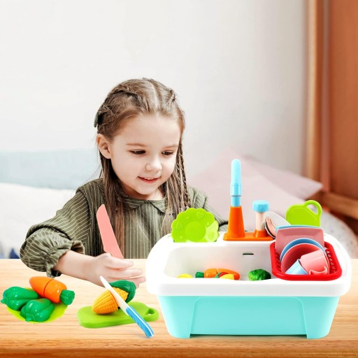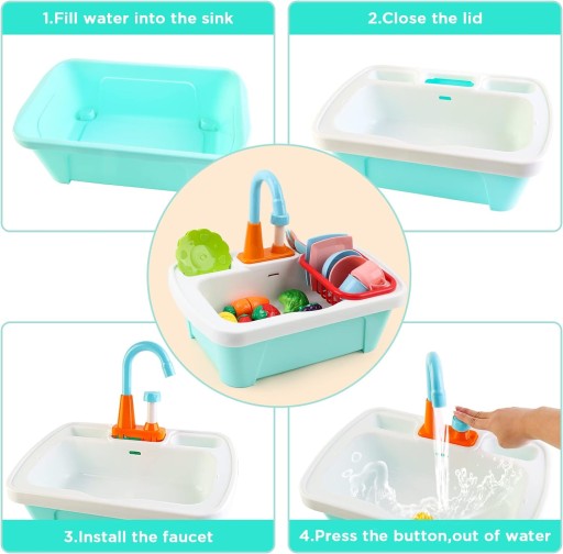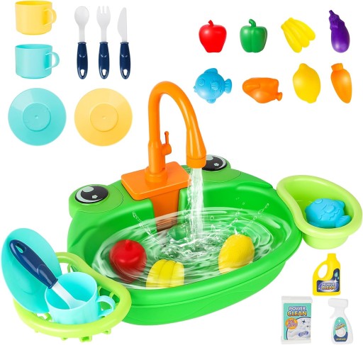 - Zabawka do odgrywania ról do zlewu kuchennego z ró?nymi akcesoriami – urocze zabawki do zlewu kuchennego z zielon? ?ab? obejmuj? 1 zlewozmywak, 1 kran, 1 kosz ociekowy, 1 kosz do przechowywania, 2 kubki do zabawek, 2 talerze do zabawek, 3 detergenty do zabawek, 8 akcesoriów do ?ywno?ci i 3 sztu?ce do zabawek. Trwa?e i bezpieczne materia?y, delikatne kolory, nie?atwe do wyblakni?cia, a realistyczny design mo?e trenowa? umiej?tno?ci samopiel?gnacji.
