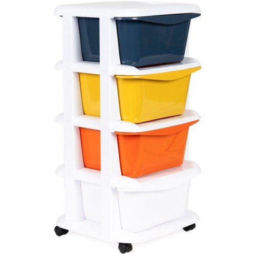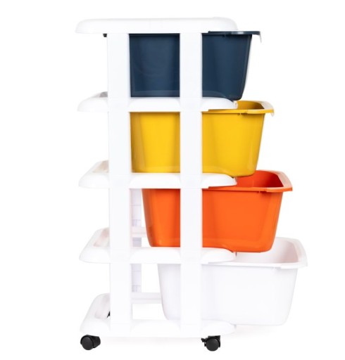 Regał składa się z czterech kolorowych szuflad, ze specjalnie wyprofilowanym uchwytem na froncie, co ułatwi Ci ich wsuwanie i wysuwanie.