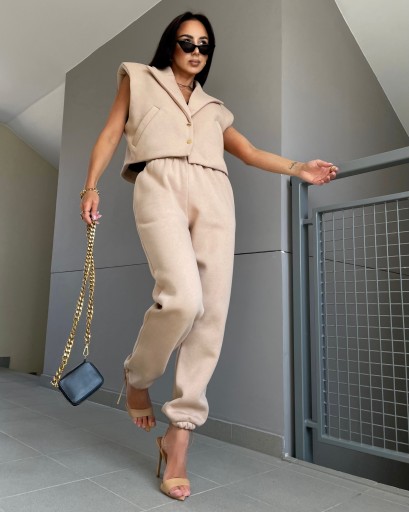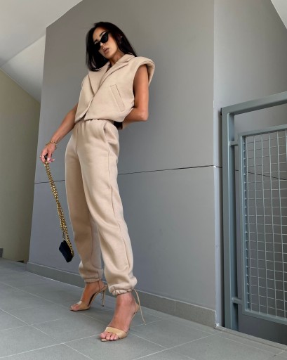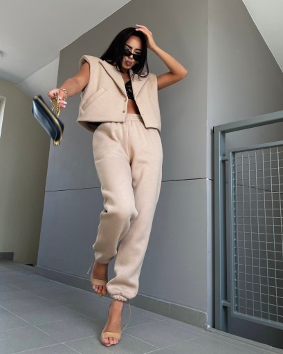 Komplet dresowy La Milla - kamizelka oraz spodnie. Spodnie posiadają gumkę w pasie oraz ściągacze przy nogawkach. Wewnątrz model wykończony jest miłym materiałem. Kamizelka posiada poduszki na ramionach oraz zapięcie na zatrzaski.