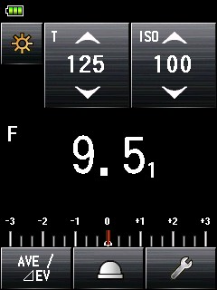 - Zakres przysłony (światło otoczenia): F0,5 do 161,2 (=128,9) w 1, 1/2, 1/3 kroku (skala analogowa: F1,0 do F90 w 1/3 kroku)