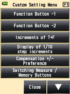 - Zakres przysłony (lampa błyskowa): F0,5 do 161,2 (=128,9) w 1, 1/2, 1/3 kroku (skala analogowa: F1,0 do F90 w 1/3 kroku)