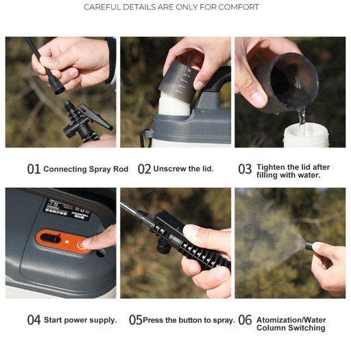 5. Różne zastosowania: Elektryczny opryskiwacz do roślin nadaje się do podlewania roślin, czyszczenia samochodu, sprzątania domu, chłodzenia zwierząt i może być używany jako opryskiwacze ogrodowe, opryskiwacze domowe, konewki do podlewania roślin.