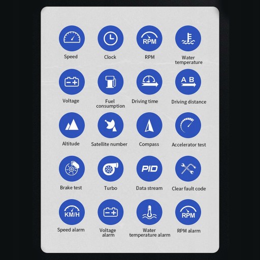 Wyświetlane informacje: prędkość pojazdu, temperatura wody, napięcie, zużycie paliwa, prędkość obrotowa, pojedynczy przebieg, całkowity przebieg, czas podróży, kierunek jazdy, liczba satelitów, wysokość, czas, ciśnienie dolotowe, temperatura oleju, stosunek powietrza do paliwa, ciśnienie turbiny , test przyspieszenia, test hamulca, kasowanie kodów usterek, odczyt strumienia danych