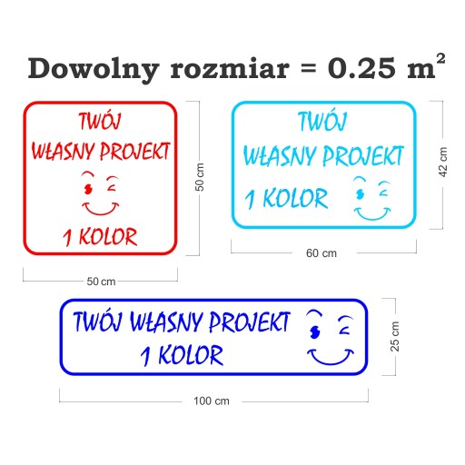 ☞ Kupując 1 sztukę, kupujesz 1 naklejkę o dowolnym rozmiarze z polem 0,25 m². Pole obliczasz, mnożąc długość przez wysokość. Do obliczenia wysokości bierzesz najwyższy i najniższy punkt, a do obliczenia długości bierzesz skrajne punkty po lewej i prawej stronie.