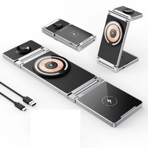 Składana magnetyczna stacja ładująca 3 w 1 ze stopu cynku: bez wysiłku ładuj do trzech urządzeń jednocześnie dzięki ładowarce Mag-Safe. Ta stacja ładująca jest kompatybilna z iPhone'ami z serii 15/14/13/12 i etui Mag-Safe (nie jest kompatybilny z modelami iPhone 11 i starszymi). Trzymaj iPhone'a serii 15/14/13/12, AirPods 3/Pro/2/Pro 2 i iWatch 2-9