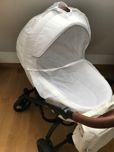 Gondola wózka jest bardzo czysta, tapicerka jest uprana, bez śladu użytkowania. Wózek ma pompowane koła, bardzo zwrotne, dzięki czemu jego użytkowanie jest prawdziwą przyjemnością. Rączka wózka obszyta jest brązową skórą ekologiczną, w tym samym kolorze jest wykonany haft na gondoli. Wózek ma standardową, odpinaną torbą na zakupy, którą także można prać. Do wózka dołączam pokrowiec na gondolę na chłodniejsze dni, mocowaną na magnes, wygodną torbę podręczną, całkiem nową siatkę na gondolę przeciw owadom, całkiem nową folię ochronną na gondolę od deszczu. Wózek składa się bardzo szybko i wygodnie.