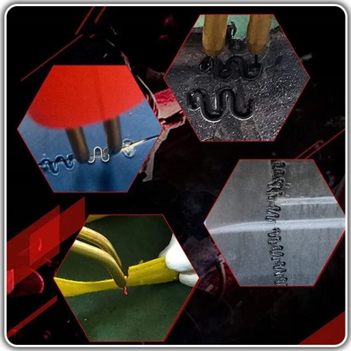 ⭐ Dzięki kształtowi grotów możesz wykonać spawanie powierzchniowe, które połączy pęknięcia lub też wykorzystać je jako zszywki.