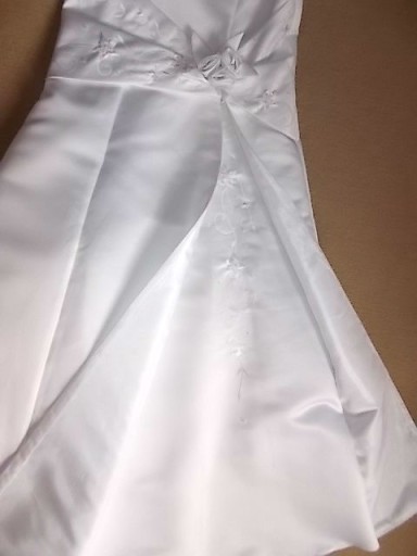 Cudna elegancka amerykańska sukienka do i po komunii z bardzo efektownego, eleganckiego białego lekko usztywnionego matowego atłasowego materiału, ozdobiona efektownym szerszym pasem z białym haftem, perłowymi koralikami i pękiem różyczek. Dół rozszerzony z lewej strony efektowny kontrafałd wewnątrz którego piękny haft z koralikami. Wewnątrz biała podszewka i dodatkowo od pasa doszyta warstwa sztywnego tiulu, rozszerzająca dól sukienki.Z tyłu kryty zameczek na którym owlekane guziczki. Sukienka jest w + bdb stanie, cudna, bardzo elegancka!!! córcia wygląda bajecznie!!Zdjęcie nie oddaje jej prawdziwego uroku!!! SERDECZNIE POLECAM!!!!