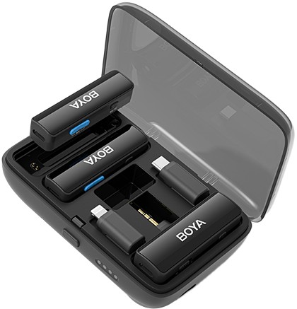 BOYALINK to bezprzewodowy system mikrofonowy z dwoma kanałami 2.4G. Wyposażony w złącza USB-C, Lightning i 3,5 mm TRS, BOYALINK jest najlepszym rozwiązaniem dla twórców treści, którzy wymagają wysokiej jakości nagrywania dźwięku bez kłopotów z wieloma złączami lub adapterami.