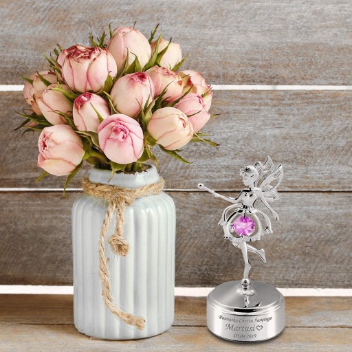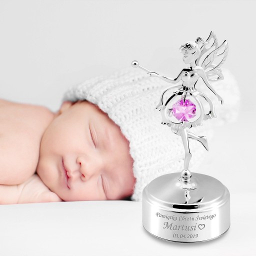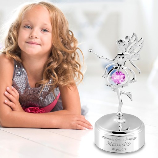 Prześliczna posrebrzana mała pozytywka z dziewczynką elfem ozdobiona różowym oryginalnym kryształem Swarovskiego oraz indywidualnym grawerem.