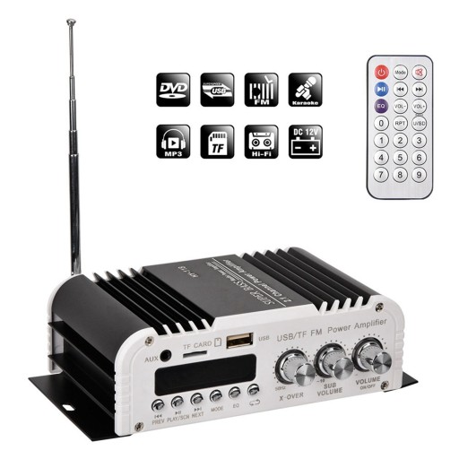 Cechy: 1. Dzięki funkcji Bluetooth możesz wygodnie słuchać muzyki. 2. Może odtwarzać muzykę z karty SD/MMC na dysku U i radia stereo FM, obsługuje format muzyczny MP3. 3. Wybierz czterokanałowe profesjonalne układy scalone wzmacniacza mocy o dużej mocy, minimalne zniekształcenia, potężna moc. 4. Przedprofesjonalny wejściowy wzmacniacz operacyjny IC do projektowania obwodów, dźwięk, przezroczysty, jasny. 5. Filtrowanie i obwód zasilania o dużej pojemności. 6. Wzór pola dźwiękowego DSP czterech. 7. 4 Sterowanie za pomocą klawiatury elektronicznej. 8. Format USB/TF MP3 automatycznie dekoduje odczyt. 9 . Regulacja głośności mikrofonu słuchawki. 10 . Wyjście dwóch głównych kanałów. 11 . Obsługuje odtwarzanie radia FM (FM: 87,5 ~ 108 MHz) 12. Z iPodem, mikrofonem, MP3, gniazdem wejściowym odtwarzacza CD/DVD. 13. Zdalne sterowanie sprawia, że obsługa jest wygodniejsza na dużej odległości. 14. Importowany wysokiej jakości układ scalony wzmacniacza, jakość dźwięku HIFI. 15. Posiadaj antenę odbiorczą. 16. Wysoki poziom głośności basów niezależnie reguluje pilotem, dzięki czemu obsługa jest wygodniejsza. 17. Olśniewający, dynamiczny wyświetlacz poziomu LED. Specyfikacja: Model: HY118 Napięcie wejściowe: DC12-15V Wymagania prądowe: > = 3A Moc wyjściowa: kanał główny 20Wx2, subwoofer 45Wx1 Dopasowanie impedancji: 4-8Ω Pasmo przenoszenia: 20HZ-20KHZ Stosunek sygnału do szumu: 80dB Port: Port pomocniczy RCA: AUX obsługuje odtwarzanie dysku U/karty pamięci TF. Komputer, telefon komórkowy, MP3, DVD itp. Materiał: aluminium Kolor: czarny Rozmiar produktu: około 16,2 * 11,5 * 5,2 cm / 6,38 * 4,53 * 2,05 cala Waga produktu: 0,38 kg Pilot zdalnego sterowania (z baterią guzikową Cr2025 3 V) Lista pakietów: 1 * Wzmacniacz stereo 1 * Pilot zdalnego sterowania 1 * Instrukcja obsługi 1 * Kabel