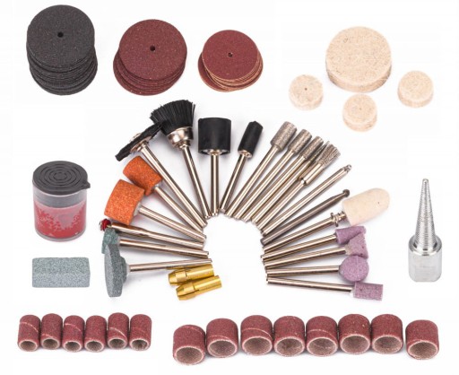 - ✔️ Zestaw trzpieni, tarcz, filców, frezów, papierów ściernych
