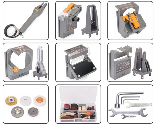 - Ostrzałka 8W1: Wiertła HSS, noże i nożyczki, dłuta i heble, łańcuchy, ostrza nożyc do żywopłotu, sekatory, siekiery, polerowanie, szlifowanie, frezowanie, cięcie, renowacja