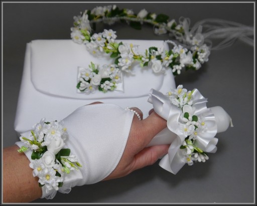Wianek wiązany do komunii idealny do alby lub sukienki komunijnej. Obwód wianka do wiązania to około 49 cm ale przez zagięcie końcówki drucika można zmniejszyć jego obwód o około 2 cm Jeśli zwiążemy trochę luźniej kokardkę to jego obwód powiększy się do oczekiwanej wielkości. Na pozostałych aukcjach można dopasować np. profitkę na świecę komunijną bransoletkę lub torebkę prostokątną lub woreczek.