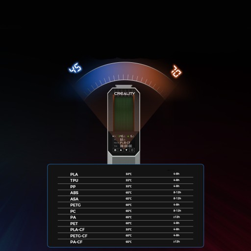 ▶ Zestaw filamentów z jednym przyciskiem: Posiada ustawienia temperatury dla różnych typów filamentów za pomocą jednego przycisku, obsługuje do 12 typów filamentów i 2 typy średnicy filamentu - 1,75 mm i 2,85 mm, w tym powszechne i wysokowydajne kompozyty, takie jak PLA-CF, PA-CF, ASA. Oczywiście, możesz też swobodnie regulować temperaturę w zakresie od 45℃ do 70℃.