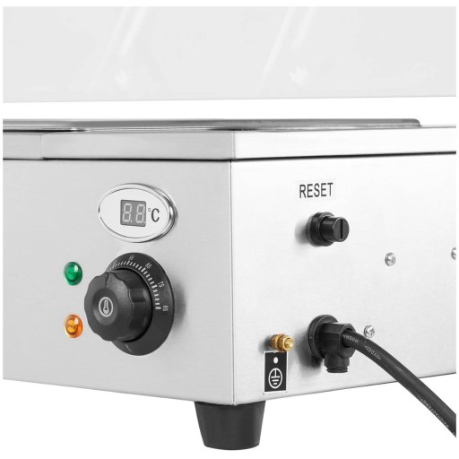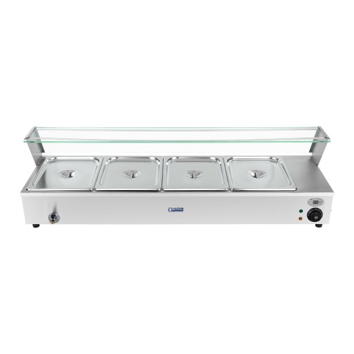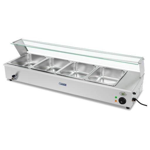 Duża moc bemaru 1800 W pozwala szybko i efektywnie nagrzać urządzenie do żądanej temperatury. Ogrzewanie konwekcyjne zastosowane w urządzeniu pozwala na dłużej zatrzymać ciepło a tym samym energię. Łączna pojemność 24 l pozwala podgrzać jednocześnie znaczne ilości dań. W zestawie znajdują się 4 pojemniki GN 1/2 o głębokości 100mm wraz z pokrywkami. W każdej chwili można je wyjąć, co ułatwia napełnianie oraz mycie. Dokładna regulacja temperatury w zakresie 25-85°C pozwala dobrać ciepło do serwowanych potraw. Termostat kontroluje temperaturę oszczędzając energię. Czytelny wyświetlacz pokazuje temperaturę wewnątrz urządzenia. Wbudowany kranik umożliwia wygodne opróżnianie wnętrza z wody. Dodatkowa szklana lada u góry pomaga w obsłudze klienta. Urządzenie wykonano ze stali nierdzewnej odpornej na korozję, łatwej w utrzymaniu czystości i nie wchodzącej w reakcje z żywnością. Frontową część oraz ladę wykonano z bezpiecznego szkła hartowanego. Bezpiecznik chroni bemar przez przegrzaniem. Stabilizację urządzenia gwarantują antypoślizgowe nóżki.