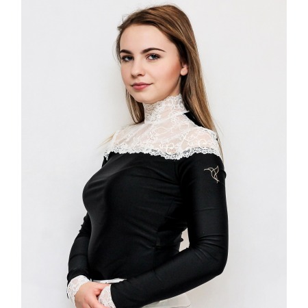 Unikalna koszula konkursowa z długim rękawem w kolorze czarnym. Wykonana z technicznego materiału, który jest niezwykle funkcjonalny, oddychający, nie krępujący ruchów. Do wykończenia górnej części koszuli oraz mankietów została wykorzystana miękka i delikatnie błyszcząca francuska koronka najwyższej jakości. Na lewym ramieniu koszuli znajduje się delikatny haft. Koszula zapinana jest z tyłu na napy, pod zapięciem znajduje się ozdobne oczko.