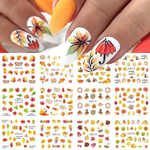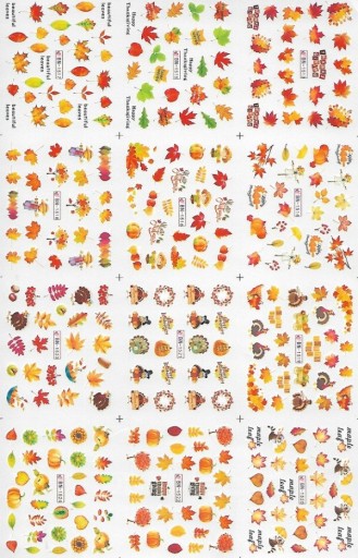 ВОДНЫЕ НАКЛЕЙКИ для украшения ногтей, лист из 12 рисунков, осенние листья