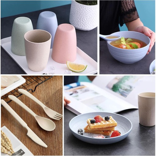 🍀 Pakiet zawiera: Ten niezniszczalny zestaw zastawy stołowej zawiera 4 talerze, 4 miski, 4 filiżanki i 4 zestawy sztućców.