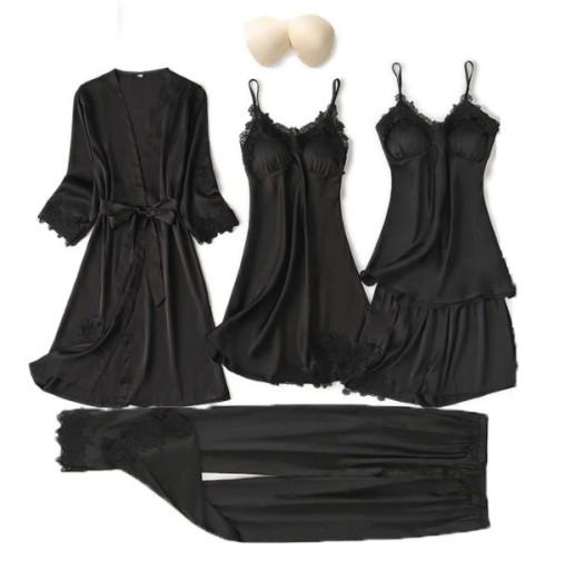 Zestaw satynowy 5 części: szlafrok, piżamka z długimi i krótkimi spodenkami, koszula nocna.
