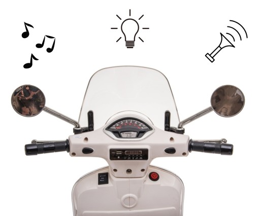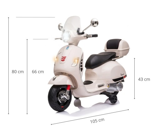 Stylowy skuter na licencji Vespa GTS Super został wiernie odwzorowany na podstawie oryginału, z dbałością o najmniejsze detale oraz wykonany z materiałów które charakteryzują się wysoką wytrzymałością i bezpieczeństwem. Posiada panel muzyczny, światła LED z przodu i z tyłu, dodatkowe boczne kółka, siedzisko z ekoskóry, przednią szybę i zamykany tylny kufer. Sterowanie i jazda na skuterze wspiera aktywność fizyczną na świeżym powietrzu, uczy podstawowych zasad bezpieczeństwa i zachowań na drodze.