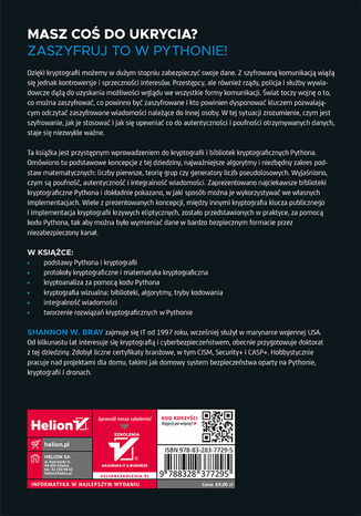Ta książka jest przystępnym wprowadzeniem do kryptografii i bibliotek kryptograficznych Pythona. Omówiono tu podstawowe koncepcje z tej dziedziny, najważniejsze algorytmy i niezbędny zakres podstaw matematycznych: liczby pierwsze, teorię grup czy generatory liczb pseudolosowych. Wyjaśniono, czym są poufność, autentyczność i integralność wiadomości. Zaprezentowano najciekawsze biblioteki kryptograficzne Pythona i dokładnie pokazano, w jaki sposób można je wykorzystywać we własnych implementacjach. Wiele z prezentowanych koncepcji, między innymi kryptografia klucza publicznego i implementacja kryptografii krzywych eliptycznych, zostało przedstawionych w praktyce, za pomocą kodu Pythona, tak aby można było wymieniać dane w bardzo bezpiecznym formacie przez niezabezpieczony kanał.
