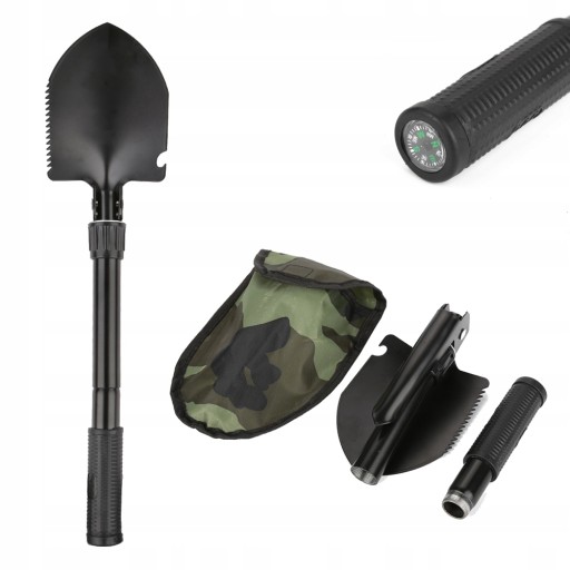 Konstrukcja wielofunkcyjna: piła, motyka trójkątna, łopata składana, otwieracz do butelek, kompas.