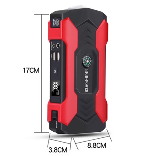 o pojemności 28000 mAh i prądzie szczytowym max. 800 A uruchamia nasz przenośny rozrusznik samochodowy w ciągu kilku sekund, bezpiecznie w samochodzie, SUV-ie, ciężarówce lub furgonetce do silników benzynowych o pojemności do 6,0 l lub silników wysokoprężnych o pojemności 3,0 l, około 30 razy po pełnym naładowaniu. Rozrusznik jest w pełni naładowany w ciągu 5 godzin i może pozostać w gotowości przez ponad 3 miesiące. Dzięki temu nadaje się do samochodów osobowych, pojazdów użytkowych, motocykli itp