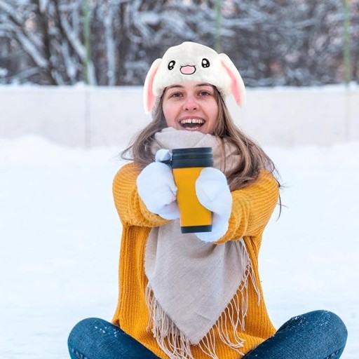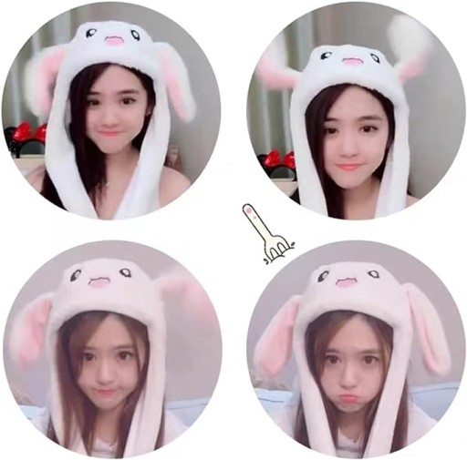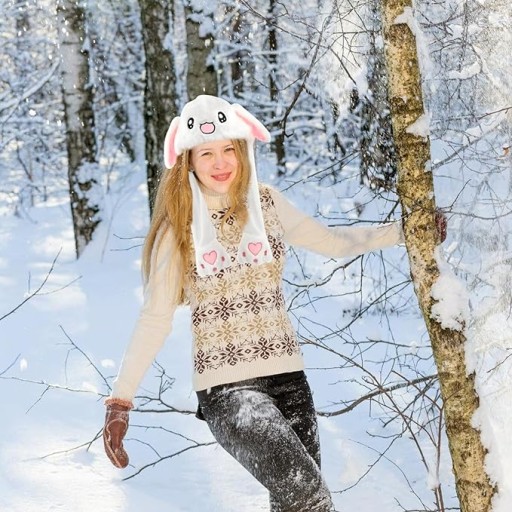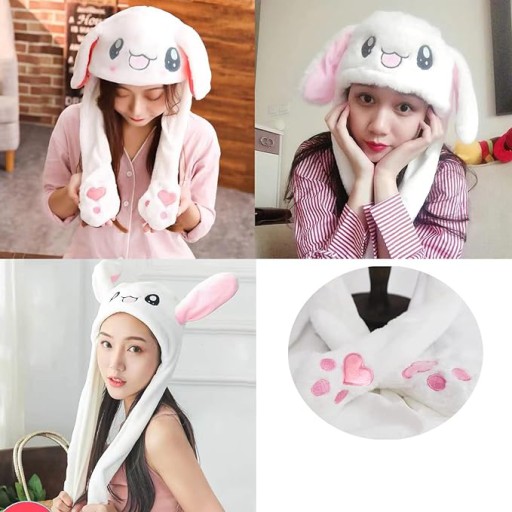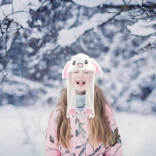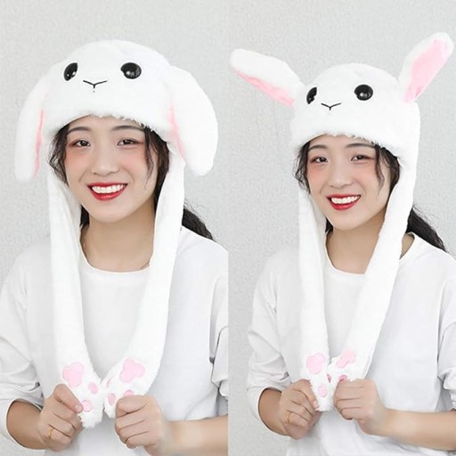 Pluszowa czapka z nausznikami ma 2 uszy królika, które wyskakują po naciśnięciu łapek. Świetne do zabawnych zdjęć.