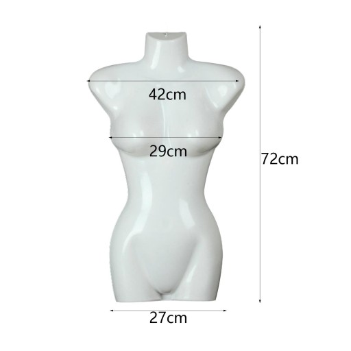 [Forma zgrabnego tułowia]: tułów wiszącego żeńskiego manekina, wysokość x szerokość 72 cm x 41,5 cm/28,35 cala x 16,34 cala, klatka piersiowa: 29 cm/11,42 cala, biodra: 27 cm/10,63 cala.