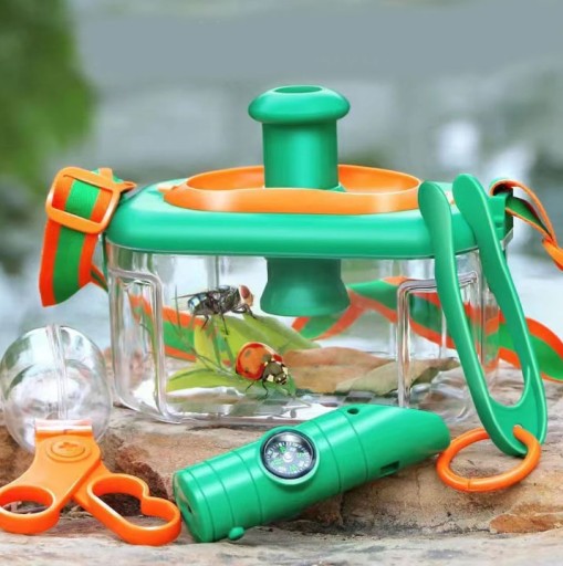 Pudełko na owady posiada przezroczyste ściany aby dziecko bez obaw mogło obserwować złapane owady czy robaczki. Posiada otwory wentylacyjne aby doprowadzić powietrze oraz lupę do dokładnego oglądania okazów. Lupą można poruszać oraz regulować powiększenie by lepiej dostrzec szczegóły.