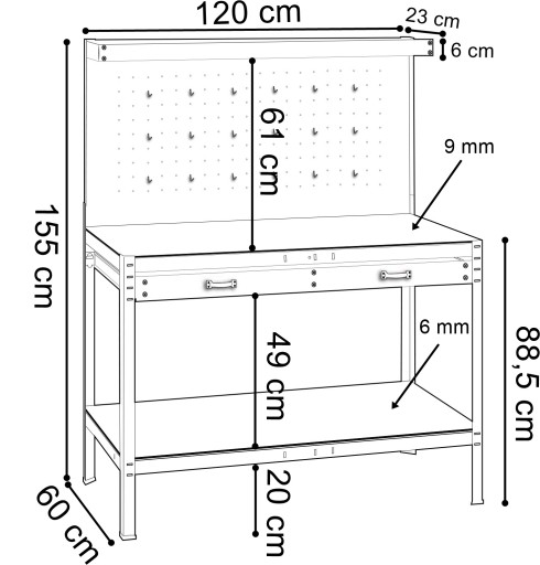 Dolna i górna półka oraz dodatkowa perforowana tablica na narzędzia z 20 haczykami umożliwiają dowolną aranżację i utrzymanie porządku w warsztacie. Maksymalne obciążenie tablicy to 20 kg.